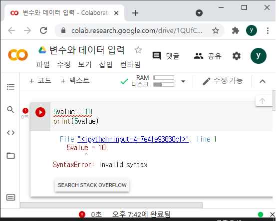 변수 명의 규칙을 어기는 경우 아래처럼 에러가 발생하거든요.