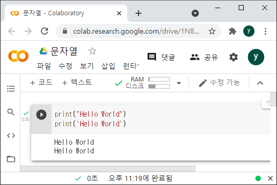앞서 print("Hello World") 코드를 입력해서 Hello World라는 텍스트가 출력되었죠.