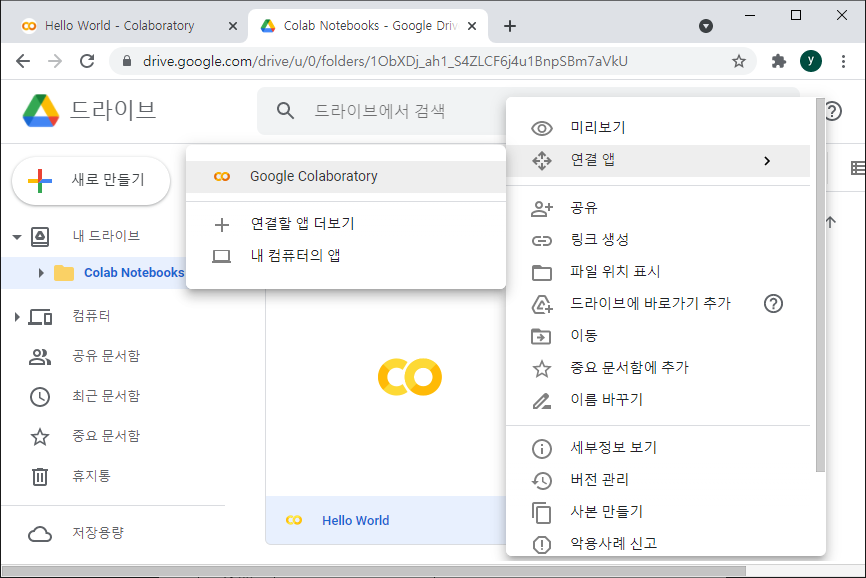 연결 앱에 있는 Google Colaboratory를 선택하시면 구글 코랩에서 선택된 코랩 노트북을 열어서 사용하실 수 있어요.