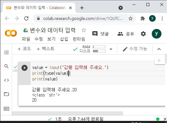 그러면 입력하신 값이 value에 대입되고, print()를 통해서 출력이 됩니다.
