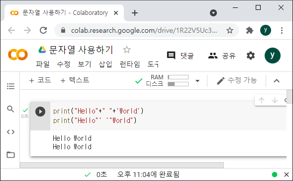 우선, 코랩 노트북의 이름을 Hello World로 변경해 주세요.