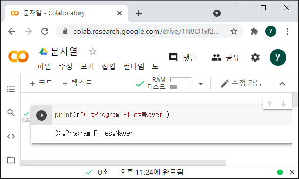 "r" 뒤의 문자열에 입력된 이스케이프 문자를 무시하고 사용할 수 있게 해줘요.
