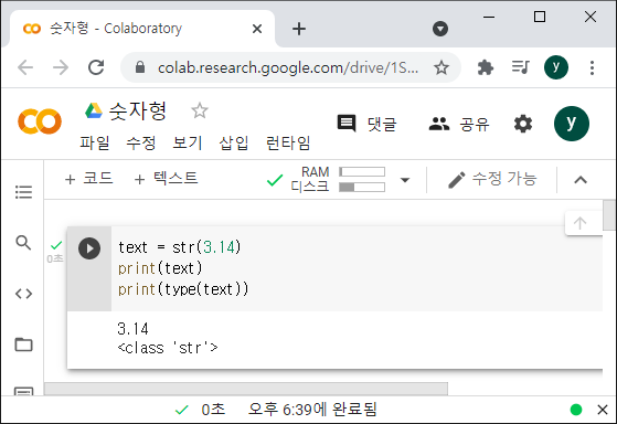 정수형이 문자열로 변경되어도 동일한 값으로 출력되지만 type()를 사용하니 문자열이라는 것을 알 수 있네요.