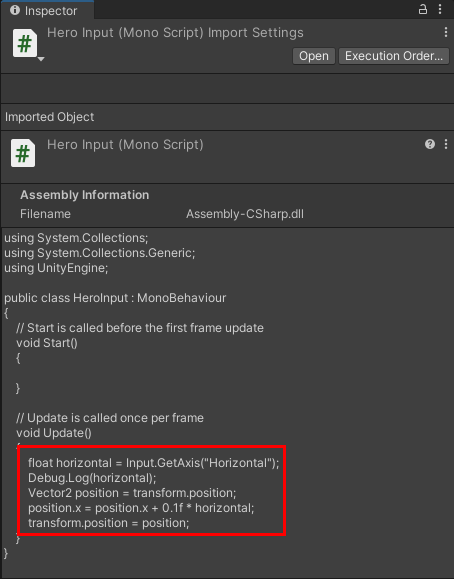 스크립트의 이름은 HeroInput으로 설정해 줬어요.
