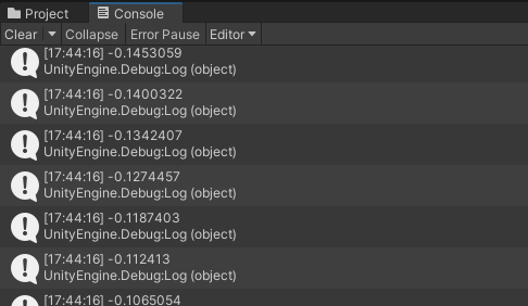 Scene을 플레이 했을 때, Console 윈도우를 보시면 위 소스코드의 Debug.Log(horizontal); 덕분에 입력된 키 값이 출력되는 것을 확인할 수 있습니다.