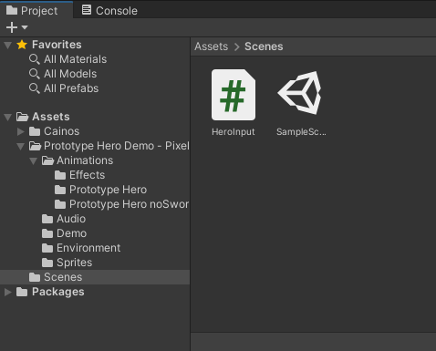 유니티에서 에셋을 임포트하시면 아래처럼 Assets 폴더 하위에 Prototype Hero Demo 폴더가 추가됩니다.