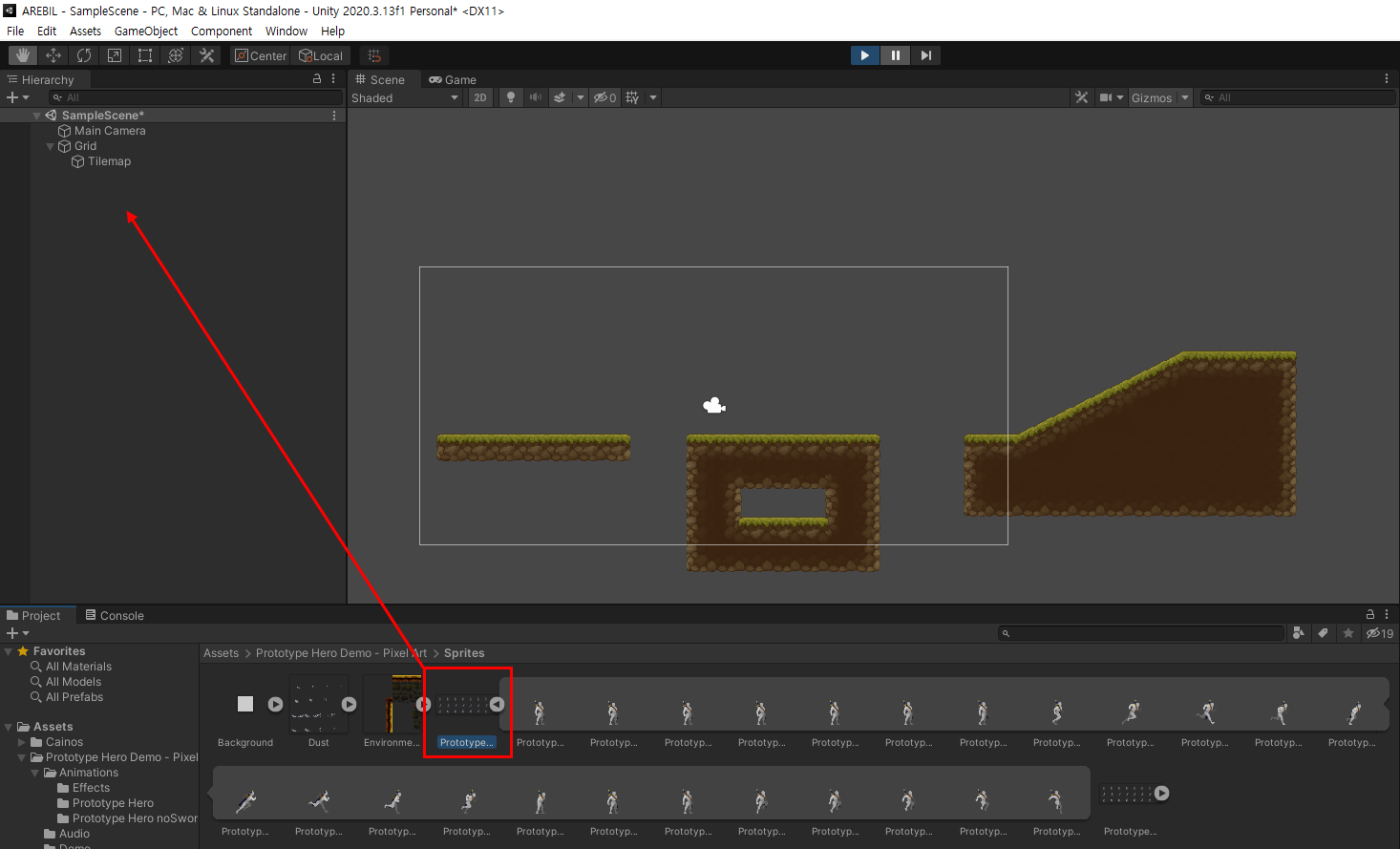 PrototypeHero.png 파일을 끌어서 Hierarchy 윈도우로 이동시켜 주세요.