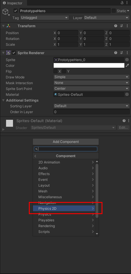 추가 방법은 캐릭터의 Inspector 윈도우에서 Add Component 버튼을 클릭하셔서 진행하시면 됩니다.