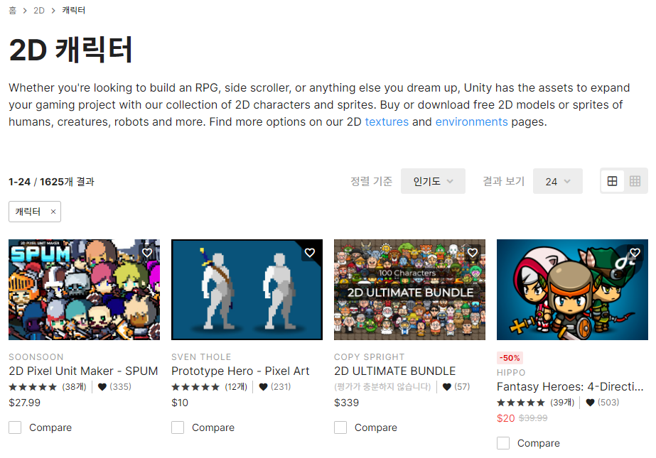 2D 캐릭터는 유니티 에셋 스토어 > 2D > 캐릭터 카테고리에서 찾으시면 됩니다.