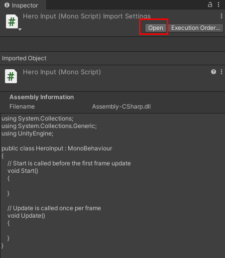 이제 생성한 스크립트를 Inspector 윈도우에서 Open 버튼을 클릭하여 수정해야 됩니다.