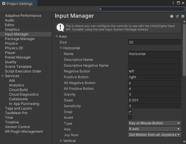참고로, Horizontal 입력에 대해서 궁금하시면 아래처럼 Edit > Project Settings > Input Manager에서 정보를 확인하실 수 있어요.