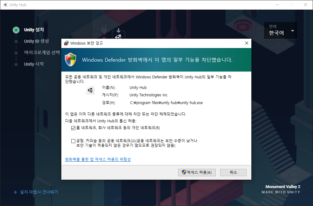 참고로 나는 기존 포스팅에서 유니티 2021.1.13f1 버전을 설치했지만, 확인하고 싶은 내용이 있어서 기존에 설치했던 Unity Hub와 유니티를 삭제했다. 그후에 D 드라이브에 Unity Hub와 유니티 2020.3.13f1 버전을 새로 설치했다. 만약에 기존의 포스팅을 통해서 2021.1.13f1 버전을 설치했다면, 굳이 설치된 것들을 삭제하고 2020.3.13f1 버전을 설치할 필요는 없다.