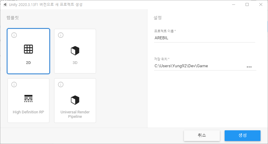 나는 나중에 출시할 게임 프로젝트의 이름으로 AREBIL을 입력했다.