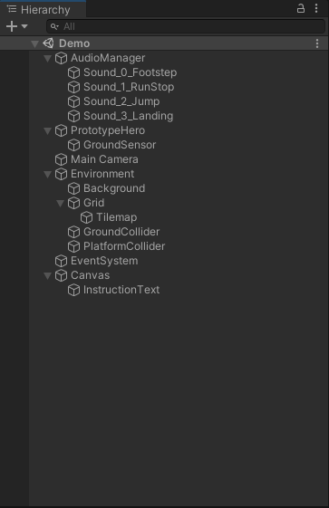 Demo Scene을 실행하면 Hierarchy 윈도우를 통해 어떤 요소들이 있는지 확인할 수 있어요.
