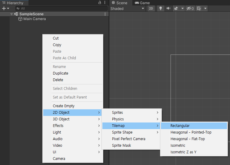유니티 프로젝트의 Hierarchy 윈도우에서 다음과 같은 순서대로 메뉴를 선택해서 사각형의 타일맵을 생성하자.