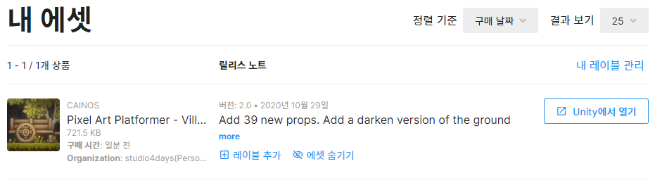 유니티에서 에셋 다운로드 화면