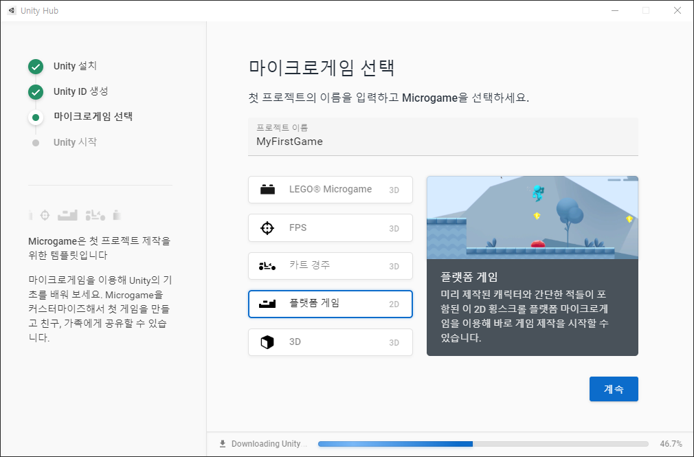 현재 포스팅하고 있는 "게임 개발 튜토리얼"은 2D 게임이기 때문에 2D를 선택하자.