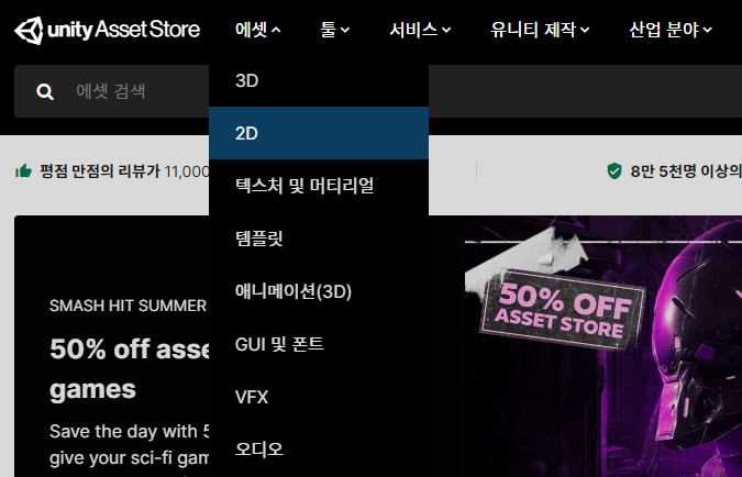 에셋스토어에서 유니티 프로젝트를 위한 에셋들을 다운로드 받을 수 있다.