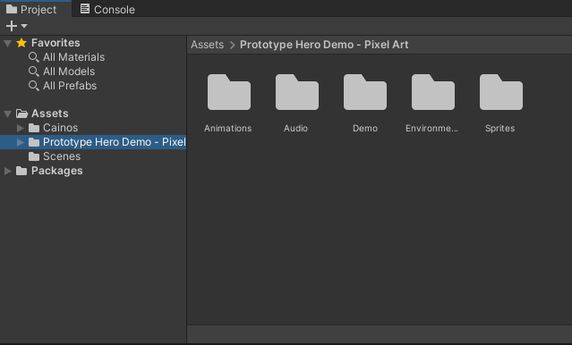 에셋이 유니티 프로젝트에 추가되면 다음과 같이 Assets 폴더에 Cainos라는 폴더가 추가된다.