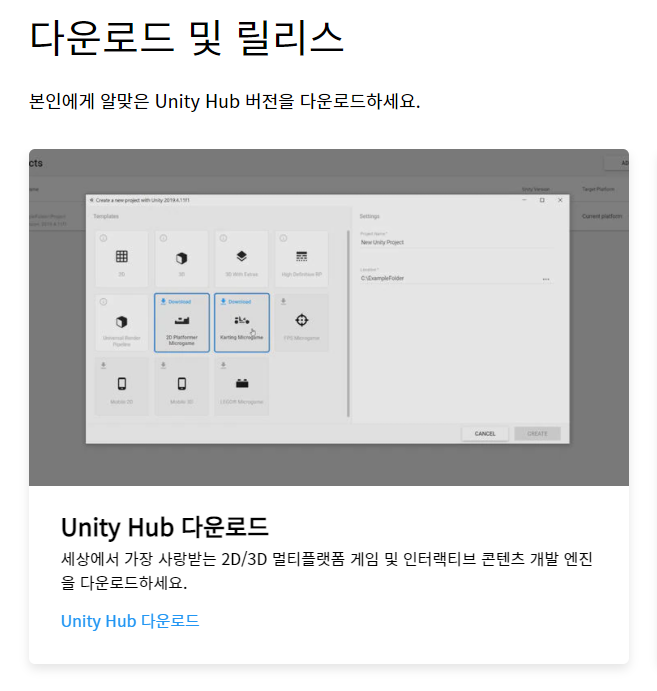 유니티 프로젝트 생성 화면
