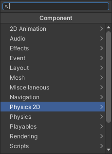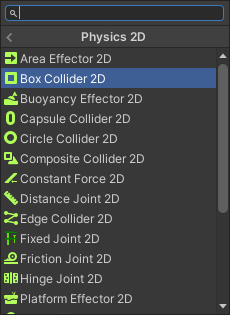 1) 원형 충돌 영역을 위한 써클 콜라이더 2D. 2) 정사각형 및 직사각형 충돌 영역을 위한 박스 콜라이더 2D. 3) 자유형 충돌 영역을 위한 폴리곤 콜라이더 2D. 4) 자유형 충돌 영역 및 완전히 닫히지 않은 영역(원형 컨벡스 코너 등)을 위한 에지 콜라이더 2D. 5) 원형 또는 마름모 모양의 충돌 영역을 위한 캡슐 콜라이더 2D. 6) 박스 콜라이더 2D 및 폴리곤 콜라이더 2D를 병합하기 위한 복합 콜라이더 2D.