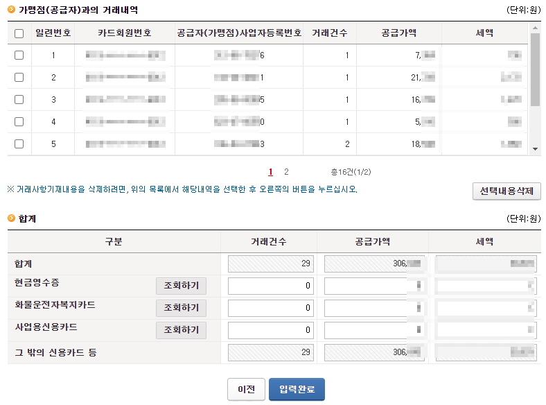 가맹점(공급자)과의 거래내역에 매입 내역이 추가되면 입력된 내용들이 합계 패널의 "그 밖의 신용카드 등" 부분에 자동으로 반영된다.