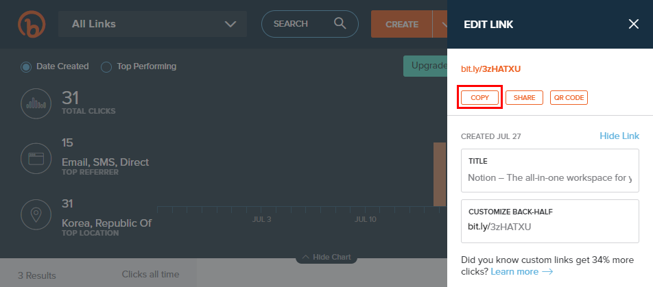 여기서 COPY 버튼을 클릭하시면 짧아진 URL을 복사해서 사용하실 수 있어요.