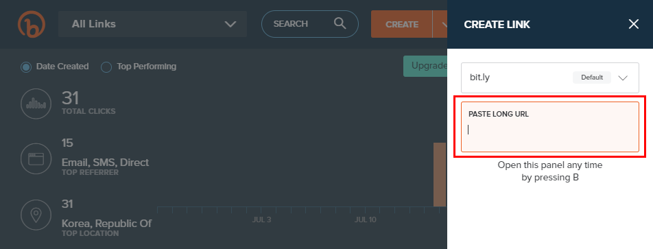 Bitly 서비스에 로그인하셔서 상단의 CREATE 버튼을 클릭하세요.