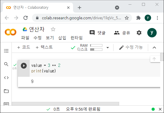 그래서 아래 예시를 보시면 3의 2승은 9라는 것을 파이썬 연산자를 통해 알 수 있어요.